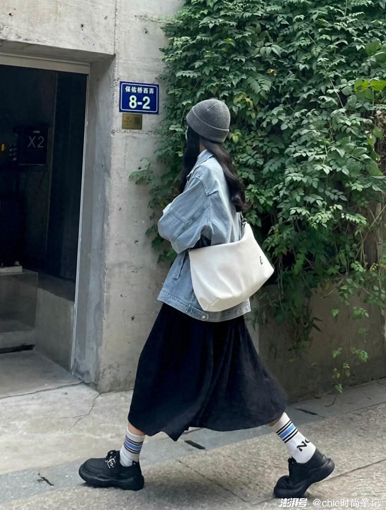 很多小姐妹一说到中性风,一般都只会联想到裤子,其实裙装也能搭配出中性美感。宽松版型的牛仔外套搭配黑色工装裙,简约的随性美,色彩低调又时尚。选择一双黑色运动鞋,会与总体更加相搭。