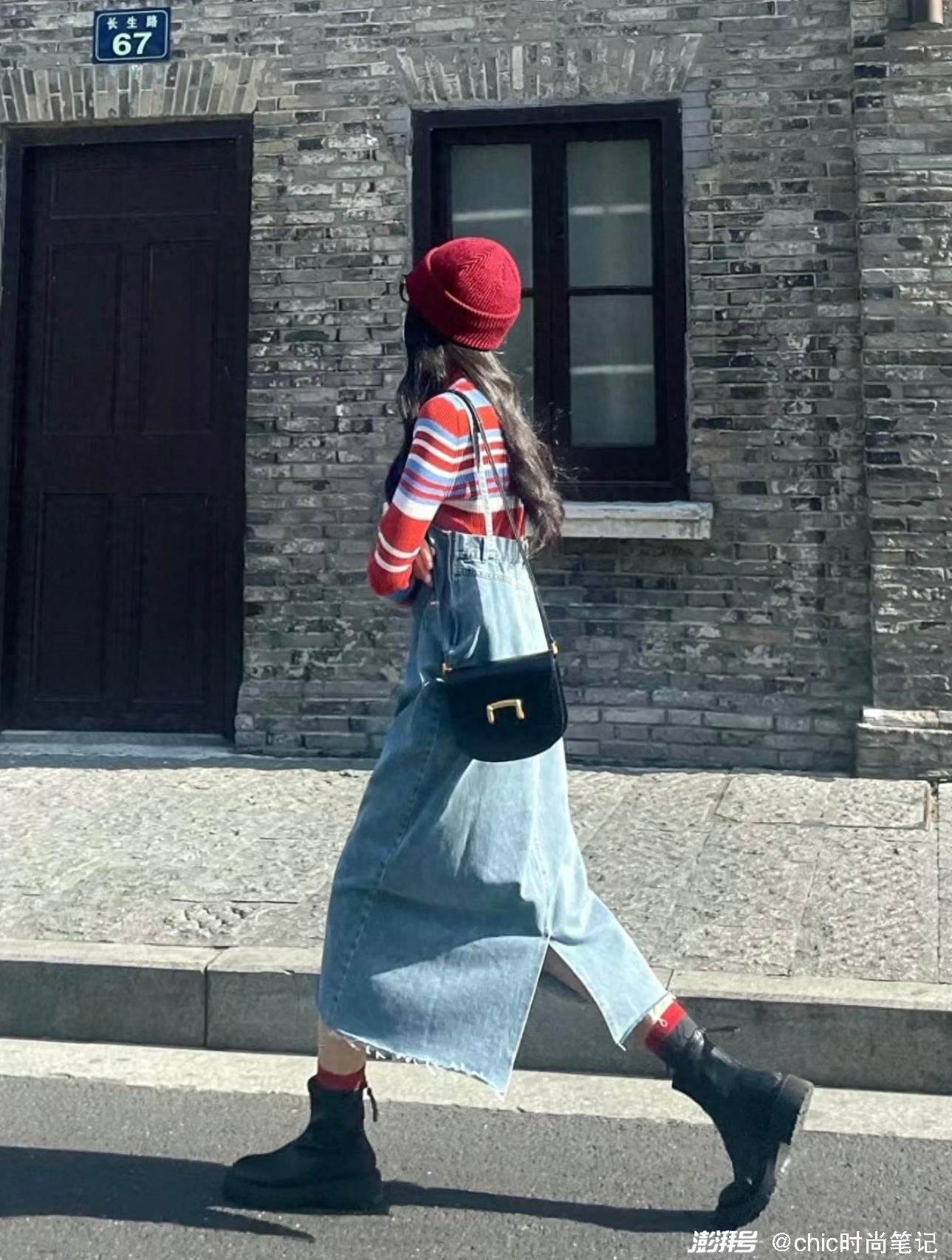 有个性的姐妹可以在选择牛仔裙的同时搭配一件亮色上衣,颜色突兀却又意外的和谐。亮色单品比较吸睛,可以搭配同样为亮色的饰品,比如模特的酒红色毛线帽和袜子,都能与上衣起到承接作用。