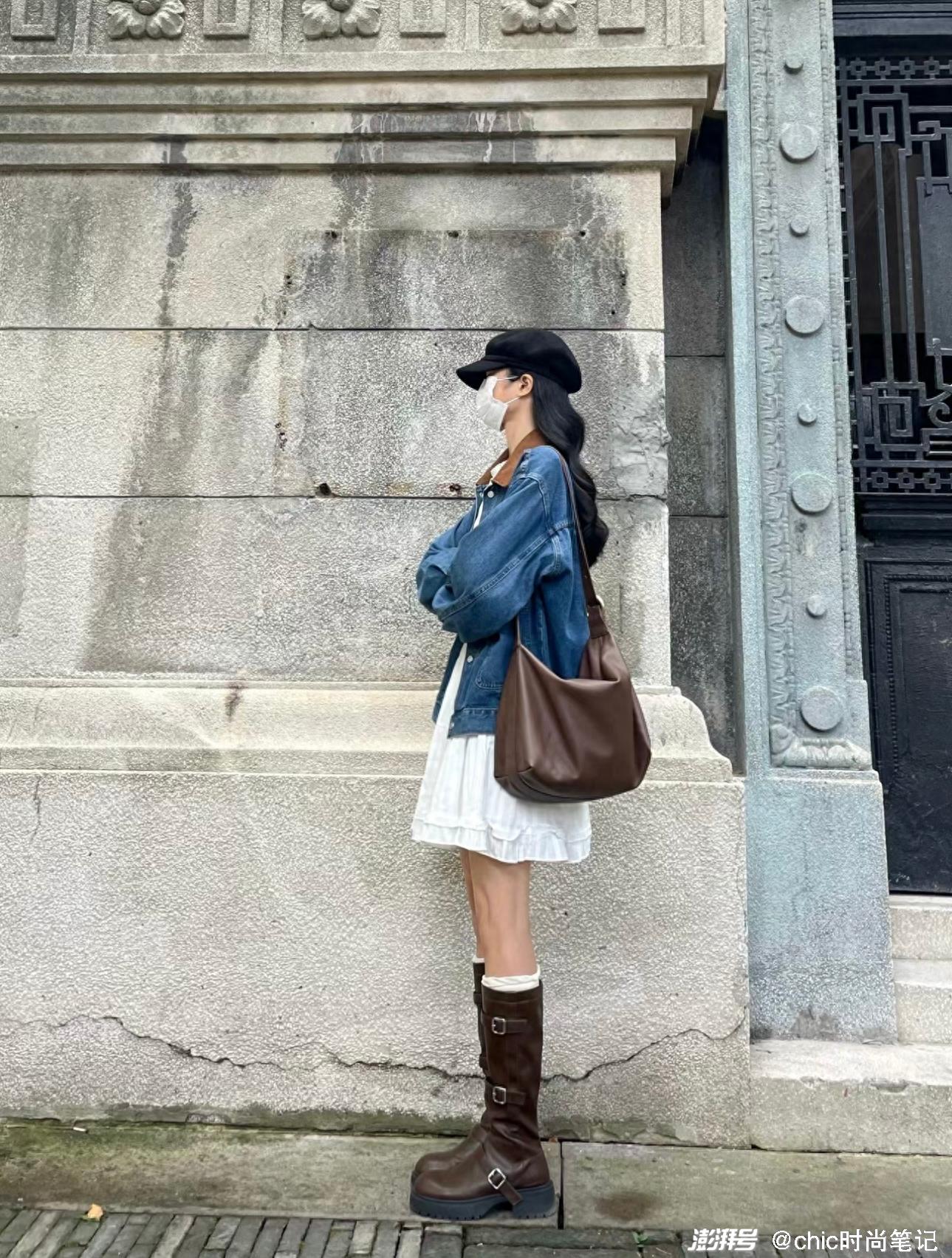 除了半身裙,连衣裙搭配外套也是不错的选择,鞋子可以高筒靴,会更有质感。