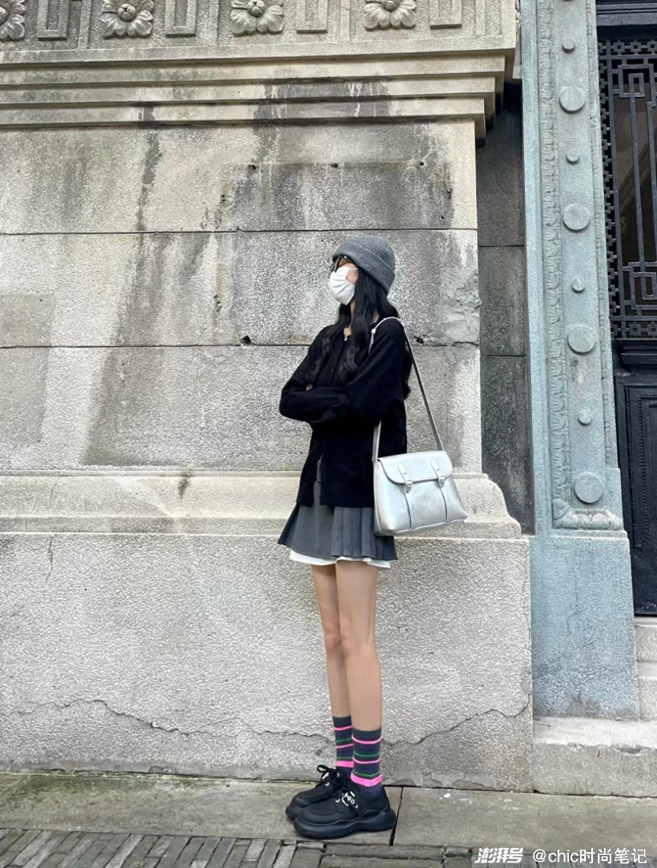 秋季的针织衫薄厚适中,也是百搭神器。黑色针织衫搭配灰色连衣裙,展现极简主义。不喜欢太过跳跃的姐妹可以选择黑色或白色鞋子,喜欢加点亮眼色彩的姐妹可以选择亮色系鞋子或者袜子作为点缀。