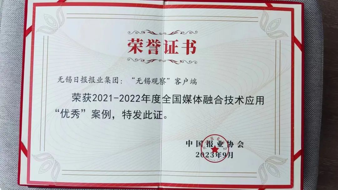 无锡观察新闻客户端荣获2021—2022年度全国媒体融合技术应用优秀案例。