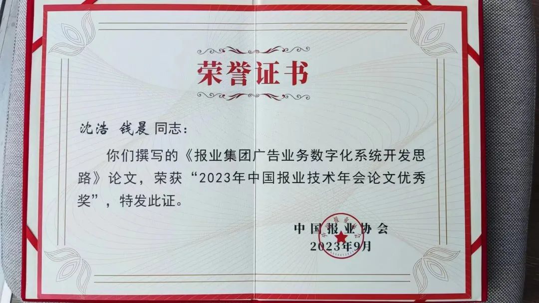 《报业集团广告业务数字化系统开发思路》一文获得2023年度中国报业技术年会论文优秀奖。