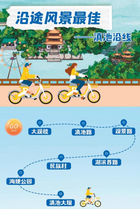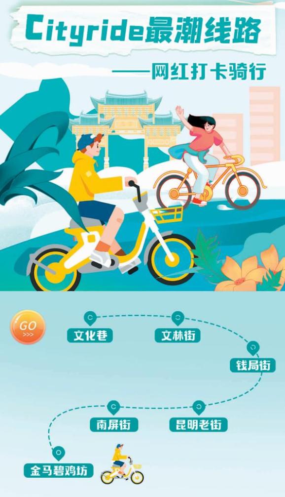 9月13日,在“国庆黄金周”即将到来之际,由市城市管理局、市公安局交警支队、市文化和旅游局共同指导,昆明报业传媒集团(昆明日报)主办,护国街道办事处和美团协办的“文明骑行 低碳出行——Cityride邂逅春城最美骑行路线”活动正式启动。活动特别邀请骑行博主、南亚留学生、资深媒体人、著名探险家4位具有行业代表性的推荐人,分别发布滇池沿岸最佳观景骑行线、昆明夜景观赏骑行线、Cityride最潮网红地打卡骑行线、翠湖周边博物馆群落骑行线4条主题骑行线路,通过骑行让市民和游客以绿色低碳的交通方式近距离感受春城昆明的自然生态、历史人文和艺术气息,并呼吁文明骑行,规范停放共享单车和共享电单车。