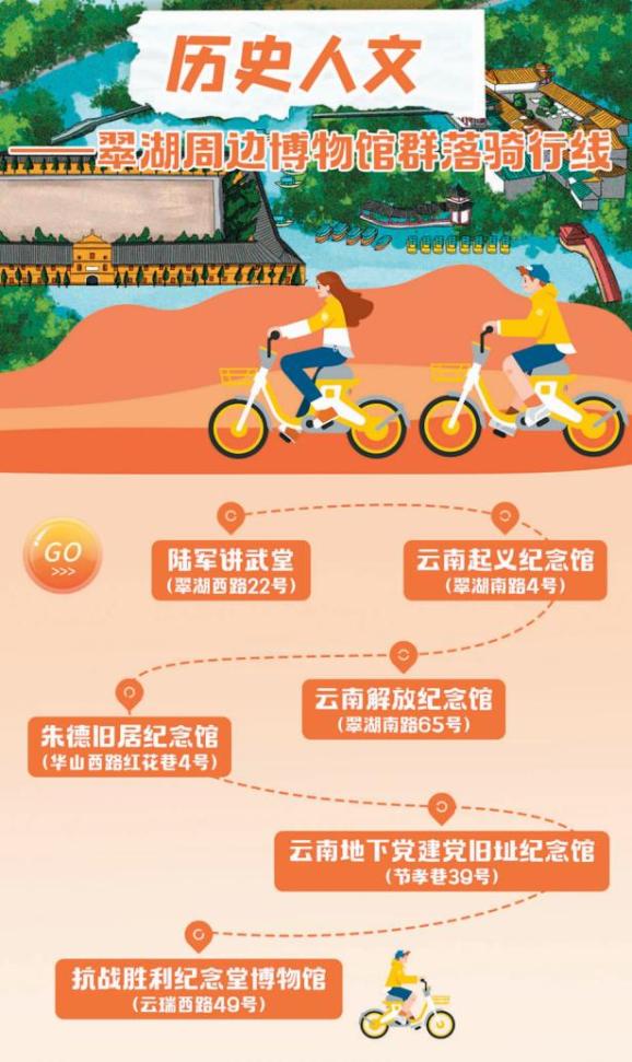 昆明作为国家历史文化名城,有历史积淀,有人文故事,其中不乏各具特色的Cityride线路。一池翠湖水,半部昆明史。翠湖及其周边是昆明历史文化资源最为富集的区域,一街一巷、一砖一瓦、一草一木皆承载着老昆明的记忆。杨丽菊是一名记者,因为各种采访与翠湖结缘,现在她几乎每周都会骑车逛翠湖,感受这里的市井生活和城市风光。“翠湖是昆明主城区的重要文化名片,拥有云南陆军讲武堂等6个历史博物馆,在这里不仅可以追忆历史、缅怀革命岁月,还能吃到很多本地特色小吃,是外地游客游玩的好去处。”