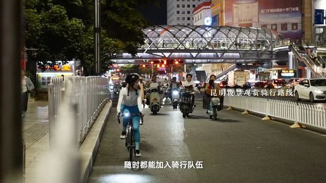 暮色四合,华灯初上。流光溢彩的夜晚,车辆川流不息,商圈人流如织。盘龙江畔,一群爱好骑行的人结伴而行,沿江一路向南。“风景美丽、道路平坦、灯光璀璨。随处可见的骑行道路、随时都能加入骑行大军。”在骑行博主“在逃小恐龙”看来,昆明是一个对骑行者友好的城市,也是绿色出行的模范之城。