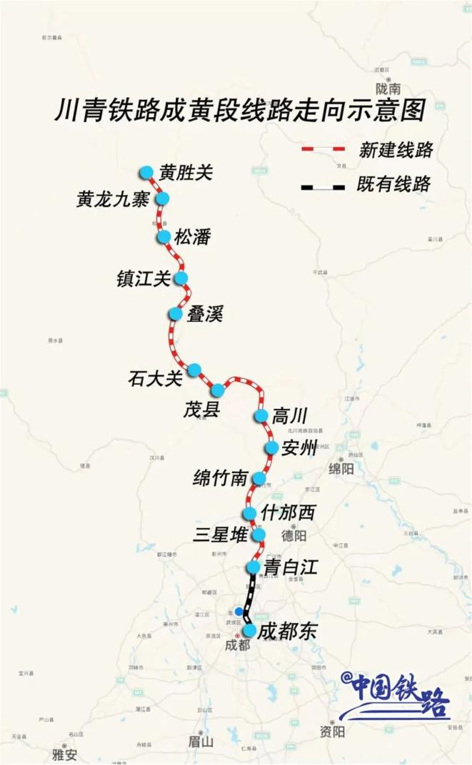 川青铁路成黄段全线共设青白江、三星堆、什邡西、绵竹南、安州、高川、茂县、石大关、叠溪、镇江关、松潘、黄龙九寨、黄胜关站13个车站,线路开通后,将极大缩短成都至黄龙、九寨沟的旅行时间。