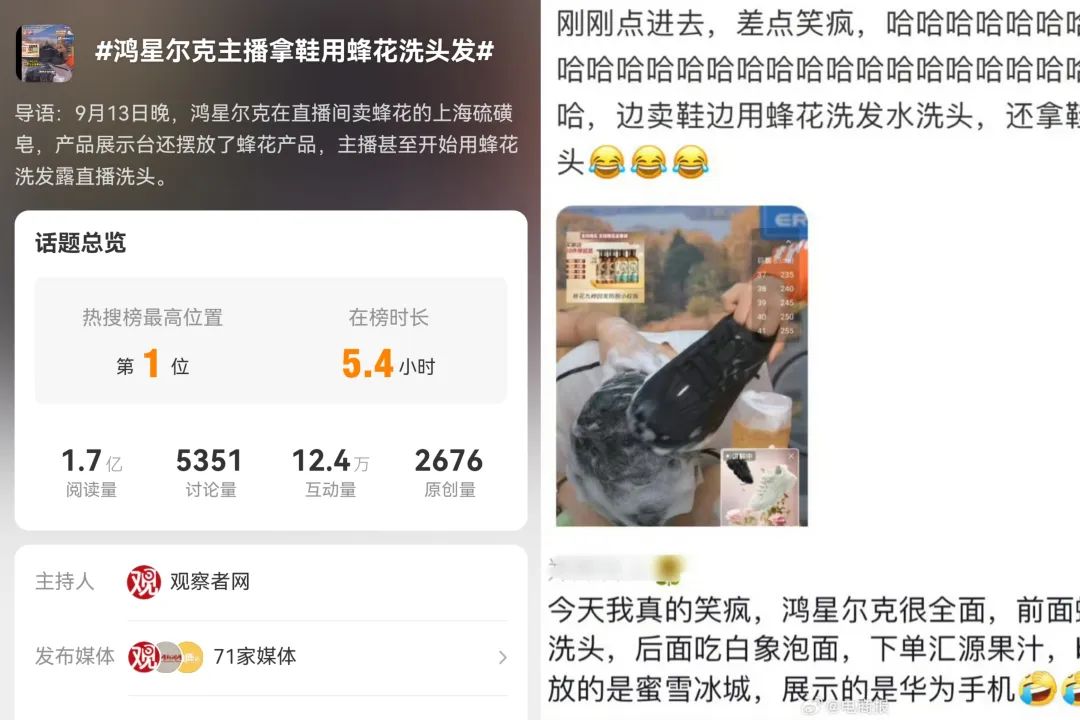 这波神级操作自然为直播间赚足了吆喝,次日下午#鸿星尔克主播拿鞋用蜂花洗头发 也登上了微博热搜,甚至被称为跨界联名的天花板。