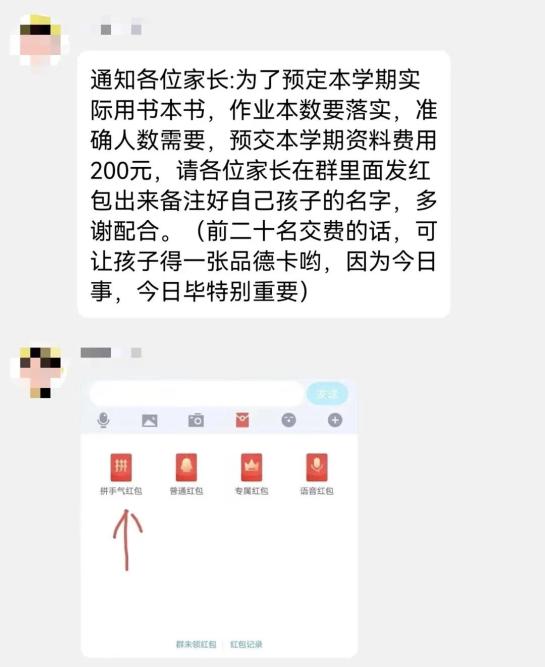 王先生的孩子目前就读于某小学一年级,从王先生提供的截图来看,该“假老师”将自己的昵称和头像改成和班级语文老师一样,在今天15:51的时候,发布一条通知:“通知各位家长:为了预定本学期实际用书本书,作业本数要落实,准确人数需要,预交本学期资料费用200元,请各位家长在群里面发红包出来备注好自己孩子的名字,多谢配合。”