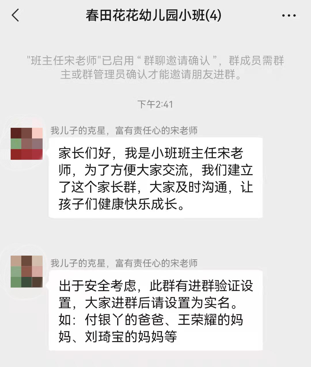 这需要群里的班主任老师加强对家长群的管理。无论是QQ群还是微信群,群管理员可通过设置“加群验证”防止骗子随意进入家长群,家长进群后,需要按要求修改自己的昵称,便于老师管理。