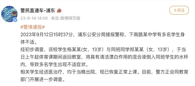 2、上海警方通报“中学生在校投放不明物质” 14日上海浦东公安分局通报,12日某中学学生杨某某(女,13岁)与同班同学郑某某(女,13岁),趁体育课期间返回教室,将具有清洁漂白作用的混合液倒入同班学生的水杯内,导致多名学生出现不适症状。相关学生经送医治疗,均于当晚出院,现已恢复正常上课。目前,警方正会同教育部门开展进一步调查。(@警民直通车-浦东)
