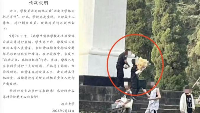 4、西南大学通报“保安扔花事件” 14日西南大学发布情况说明:9月9日,2名学生前往学校毛主席塑像前献花并进行直播。学生离开后,学校保卫处现场工作人员黄某,未经请示擅自安排保安将鲜花移到值班室外墙边,未发生“践踏花束、乱扔垃圾桶”行为。因黄某现场处置不当,决定对其停职检查。(@西南大学)
