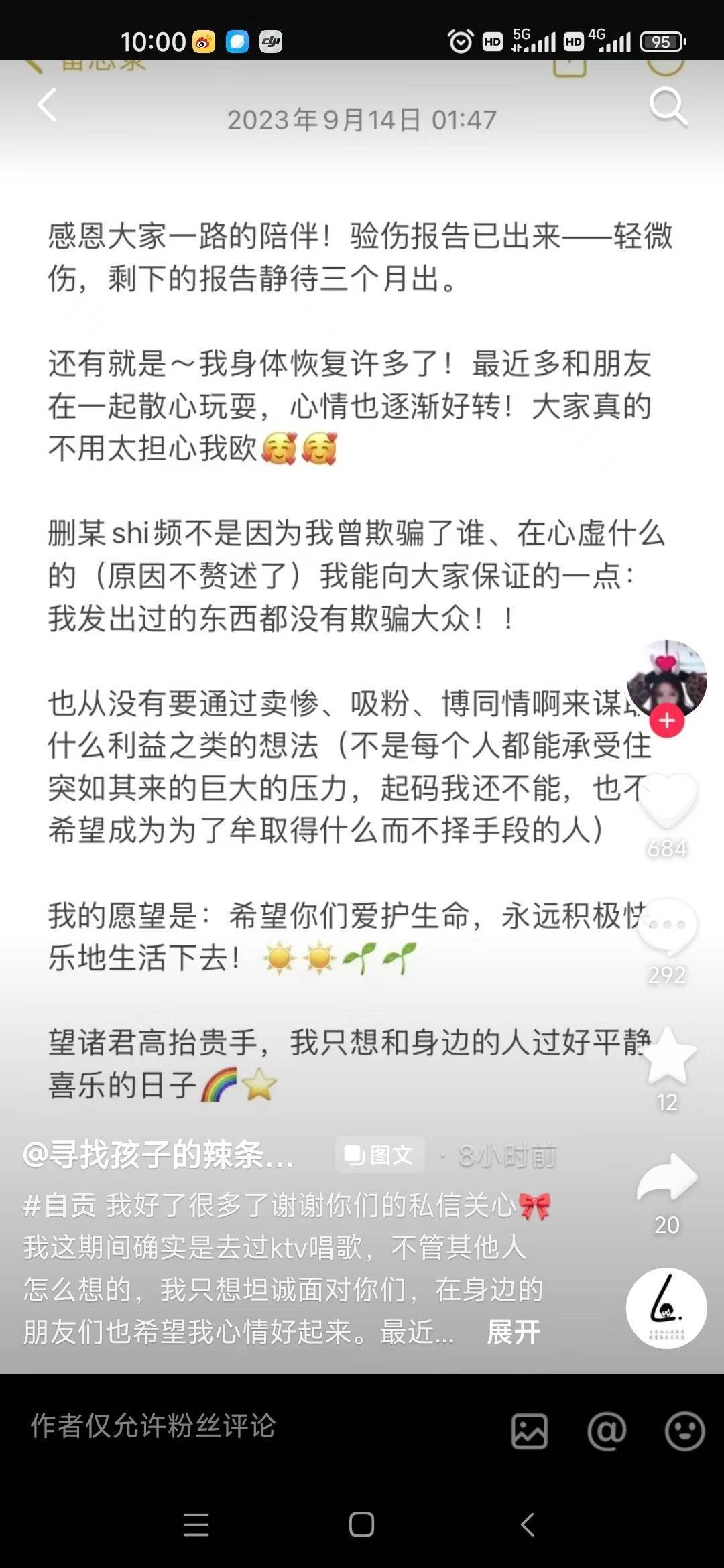 上述视频被删除后,张某瑶于9月14日01:47发布了一条文字称,自己的伤情鉴定为轻微伤,身体恢复了许多。张某瑶反复强调,删除视频“不是因为我曾欺骗了谁、在心虚什么的(原因不赘述了),我能向大家保证的一点:我发出过的东西都没有欺骗大众!”她希望“诸君高抬贵手,我只想和身边的人过好平静喜乐的日子。”