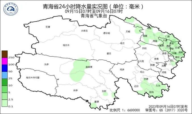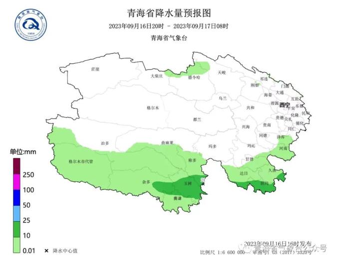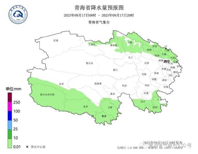 09月17日20时~09月18日20时:西宁、海东、海西东部、玉树、果洛、黄南及门源、海晏有小雨,其中杂多、治多部分乡镇有中雨,省内其余晴或多云。