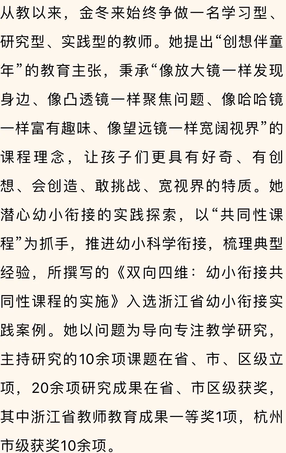 高级教师,曾获浙江省教改之星银奖、杭州市教坛新秀、余杭区学科带头人、余杭区优秀班主任、教育铁军先锋号银奖等荣誉。