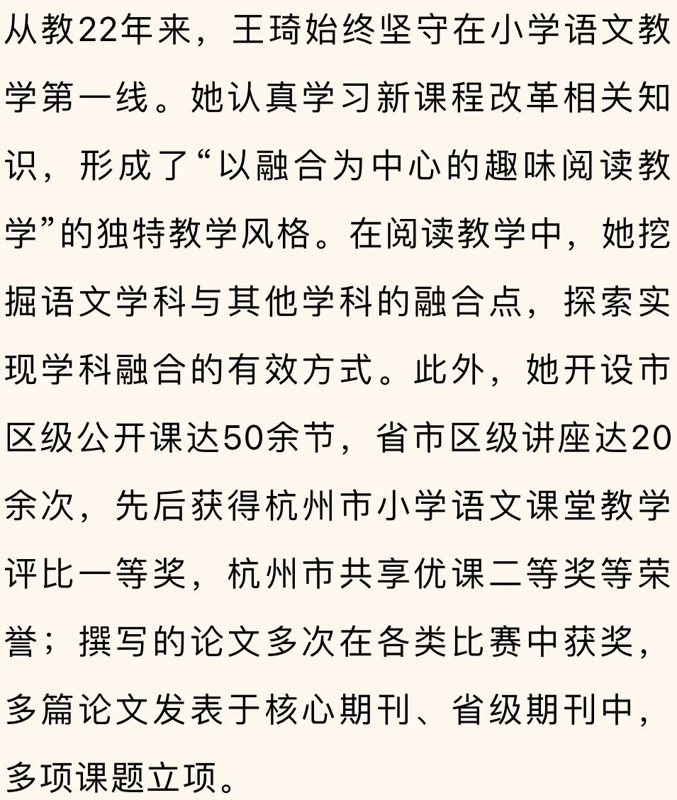 中共党员,高级教师,曾获得杭州市教坛新秀、余杭区学科带头人等荣誉。