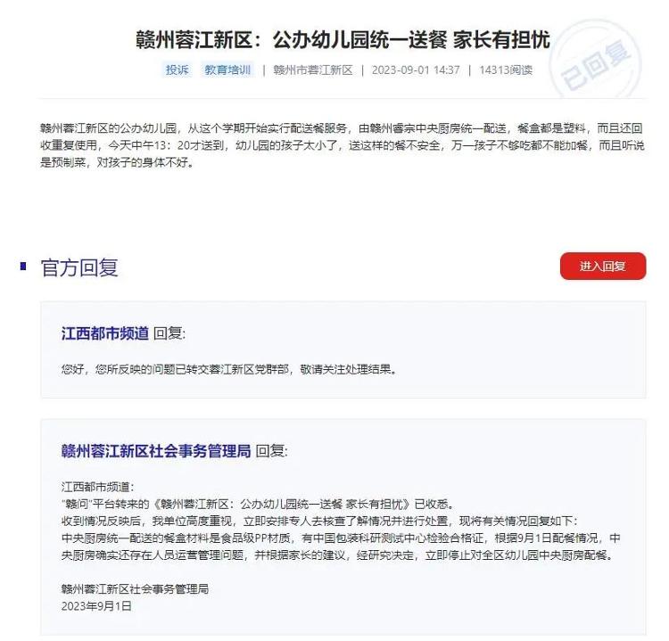 目前,赣州市蓉江新区已停止对全区幼儿园进行中央厨房配餐,而中小学的饭菜仍由中央厨房提供。蓉江新区社会事务管理局文教体科工作人员对媒体回应称,中央厨房的配餐并非预制菜。