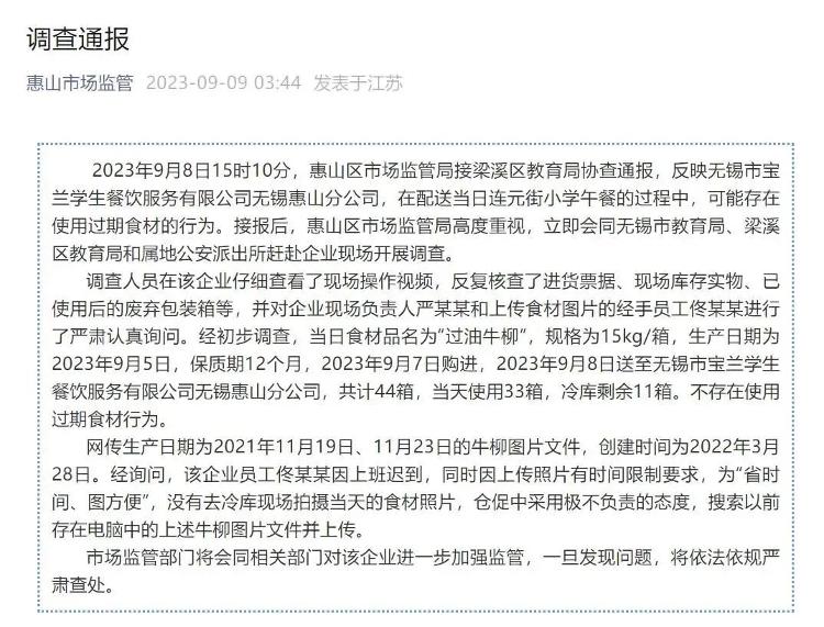 9月9日,无锡市惠山区市场监管局发布调查通报称,不存在使用过期食材行为,网传过期照片为员工图方便搜索以前存在电脑中的牛柳图片文件并上传。