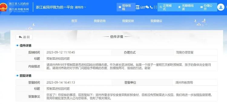 针对家长们的担忧,近期有多地教育部门回应。9月14日,湖州市教育局回复“预制菜进校园问题”,称湖州市要求学校食堂采购新鲜食材,目前没有预制菜进入校园,将进一步加强监督管理。
