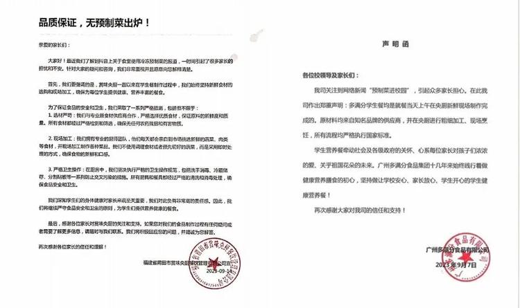 目前,还有多家餐饮公司回应。9月7日,广州多满分食品有限公司发声明称,学生餐均是就餐当天上午在央厨新鲜现场制作完成的。