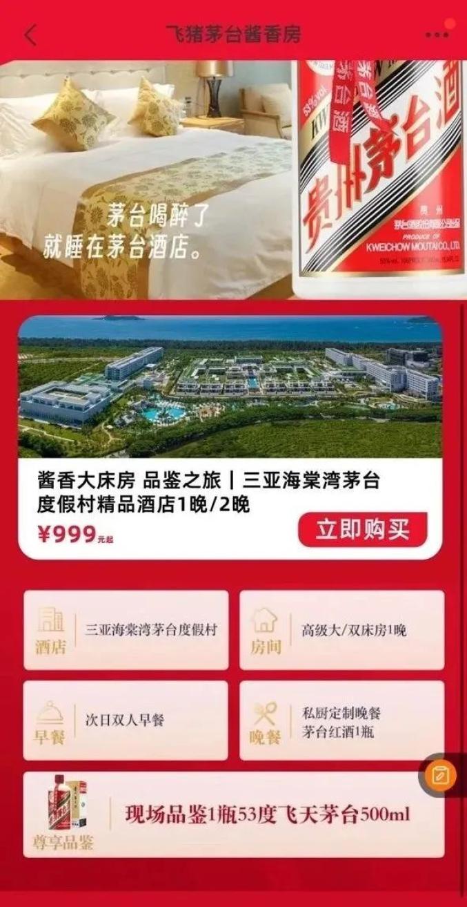 近日,阿里旗下的旅行平台飞猪发布与茅台的合作,推出了999元一晚起的酱香大床房。999元入住位于三亚的茅台大酒店,还可以喝一瓶市场定价1499元的飞天茅台。