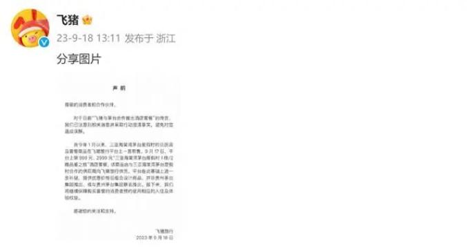 自今年1月以来,三亚海棠湾茅台度假村的日历房及套餐商品在飞猪旅行平台上一直有售。9 月17日,平台上架 999 元、2999 元“三亚海棠湾茅台度假村 1晚/2晚品鉴之旅”酒店套餐,该商品由与三亚海棠湾茅台度假村合作的供应商向飞猪旅行供货,平台在此基础上进一步补贴,提供优惠价格后组合设计商品,并非贵州茅台集团推出、或与贵州茅台集团联名推出。接下来,我们将继续保障购买套餐的消费者预约使用相应的入住及体验权益。
