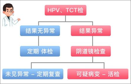 可以简单理解为:如果你的检查结果一路绿灯,那就不用经历活检这个环节,但是如果出现了“异常”信号,那就要进行阴道镜检查或活检,来进一步诊断。阴道镜检查大家应该也有所耳闻,它是在强光源照射下,通过阴道镜将组织放大6~30倍,由此来观察阴道、阴道、宫颈的上皮病变。