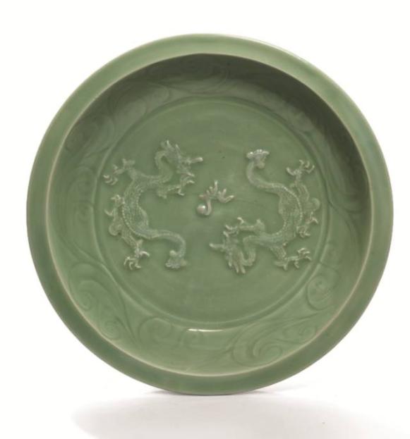 龙泉青釉贴花双龙戏珠纹折沿大盘