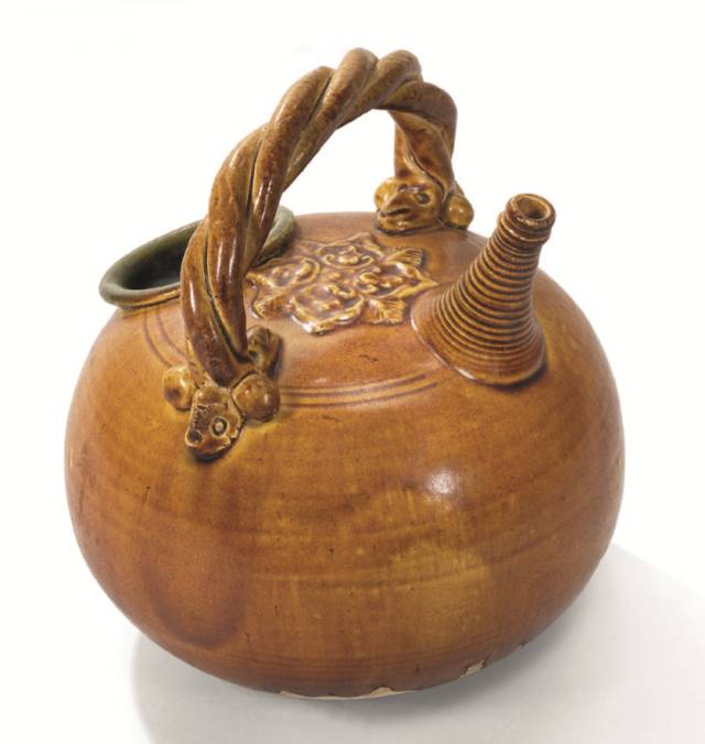 辽 三彩贴宝相花猴耳提梁壶
