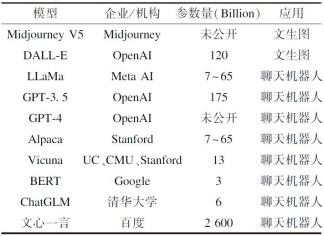 以GPT[4]为例,2023年涌现了大量的大型语言模型(Large Language Models,LLMs)[5-6]和AIGC相关领域[7-8]的研究。以GPT-3、GPT-4为代表的超大规模预训练模型,以数据和算力优势取代了一些小型算法模型,展示了一条通向通用人工智能的可行路径[9]。表1列举了国内外主流AIGC大模型和应用概况。