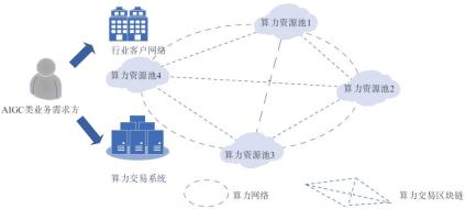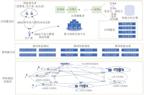 应用服务层主要包括智能运维、可信交易、开发支撑、综合管控四大功能,其中AIGC类业务通过算力网络交易平台进行交易。为了保证安全性和可靠性,交易采用区块链分布式账本记账的方式,以链式数据结构存储交易信息,并将信息保存在链上,确保任何数据都是真实且不可篡改的。