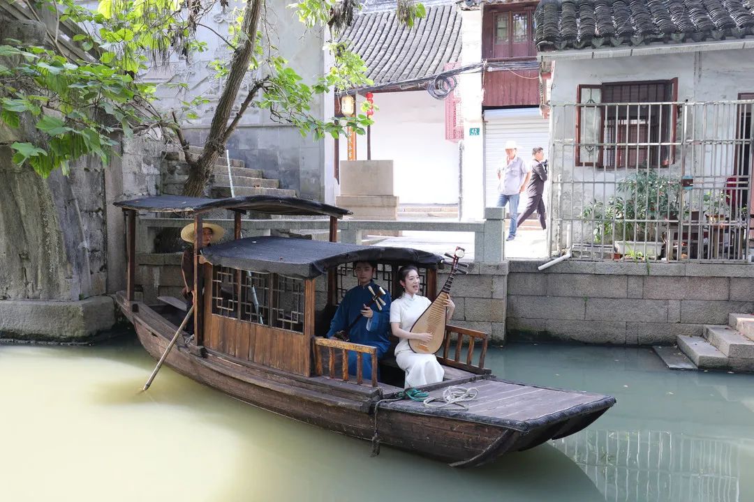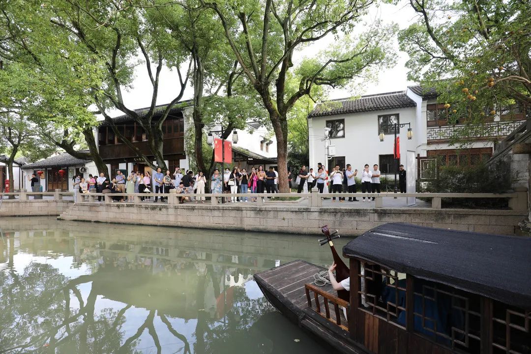 寻声向前,大家沿石板竹径穿行而过,古镇石桥边的一条游船上,一场“评弹快闪”正在进行。这也是此次研学活动的特色项目之一。两位评弹演员置身水上船中,光影斑驳、丝弦交织,《党的叮咛》等曲目流淌而出,以评弹特有的艺术魅力歌颂革命先辈的坚强党性和深厚家国情怀。岸边的观众们全神贯注,被轻清柔韵的唱腔和厚重精彩的情节深深吸引。不用担心听不懂唱词,市河边上早已贴心地准备好唱词板,帮助大家更好地理解曲目内容。