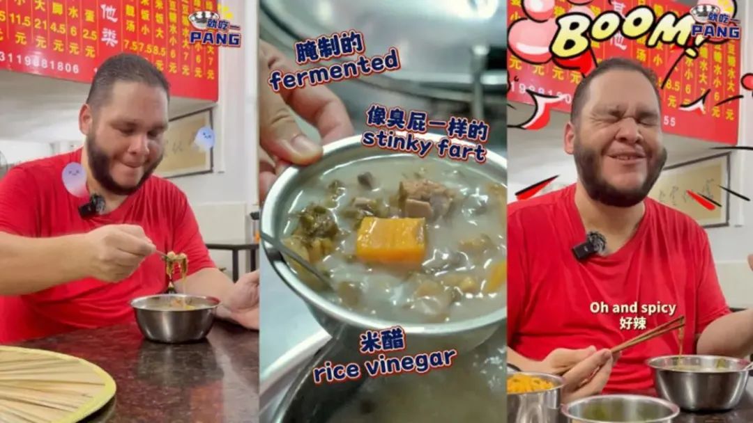 Ruben点的招牌菜式很快就上桌,首先是用腌制3个月的米醋煲出的大名鼎鼎的“三水臭屁醋”。没想到,Ruben竟然在尝试第一口就“真香了”!