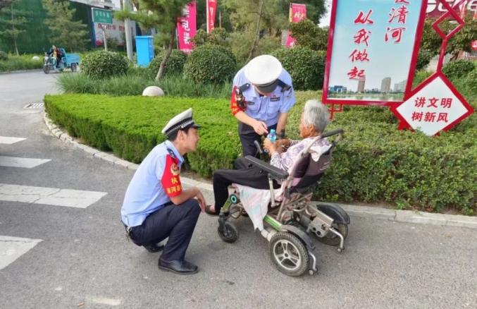 9月17日16时58分许,清河县交通警察大队公路巡警二中队张志富、宋香宽、张石磊、裴一民在巡逻至新世纪大街与渤海路路口时,发现新世纪大街北侧方向逆向停着一辆轮椅车,车上坐着一位老人。此时, 新世纪大街与渤海路路口车来车往,车速快,车辆多,场面十分吓人,老人处境危险。见此情况,民警立即赶到老人身边,先将老人推至路边安全处,随后耐心询问老人的家庭住址和家人联系方式。