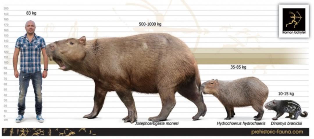 在距今 400 万年到 200 万年的新生代上新世到更新世,南美洲存在过一种巨型豚鼠 Josephoartigasia monesi ,中文译名有国父巨豚、约瑟夫巨豚等等。从骨骼化石推断,国父巨豚的外形和水豚很相似,只是尾巴略长,体型则要大得多,全长约 3 米,肩高 1.5 米,体重估计能有 1 吨。