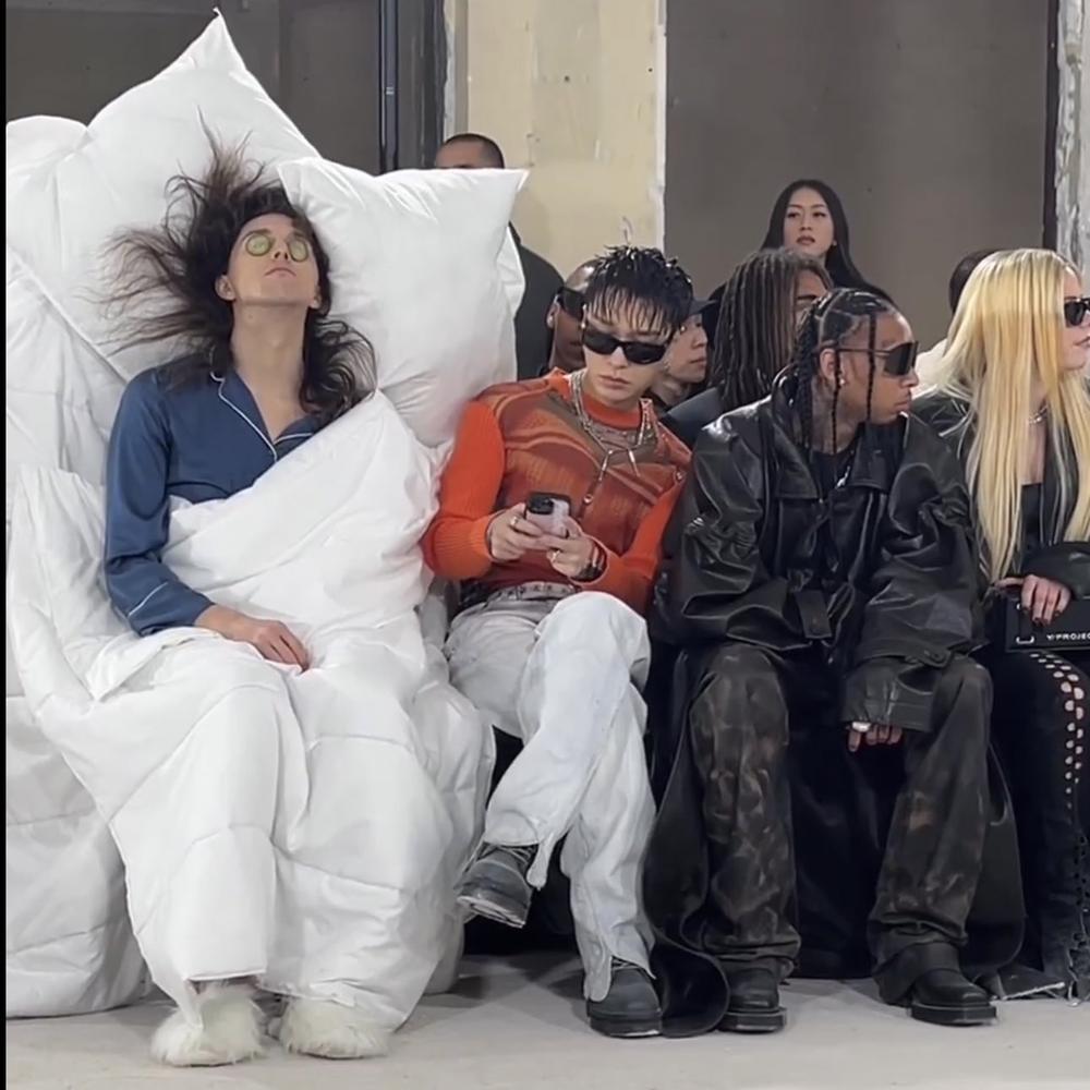 自带全套床品出现在 Y/PROJECT 2023 秋冬秀场上,在 AMIRI 秀场上举哑铃, 在 Loewe 秀场前排织毛衣,以及化身卓别林,穿上 Crocs x MSCHF 的联名超大号黄色洞洞靴出场。