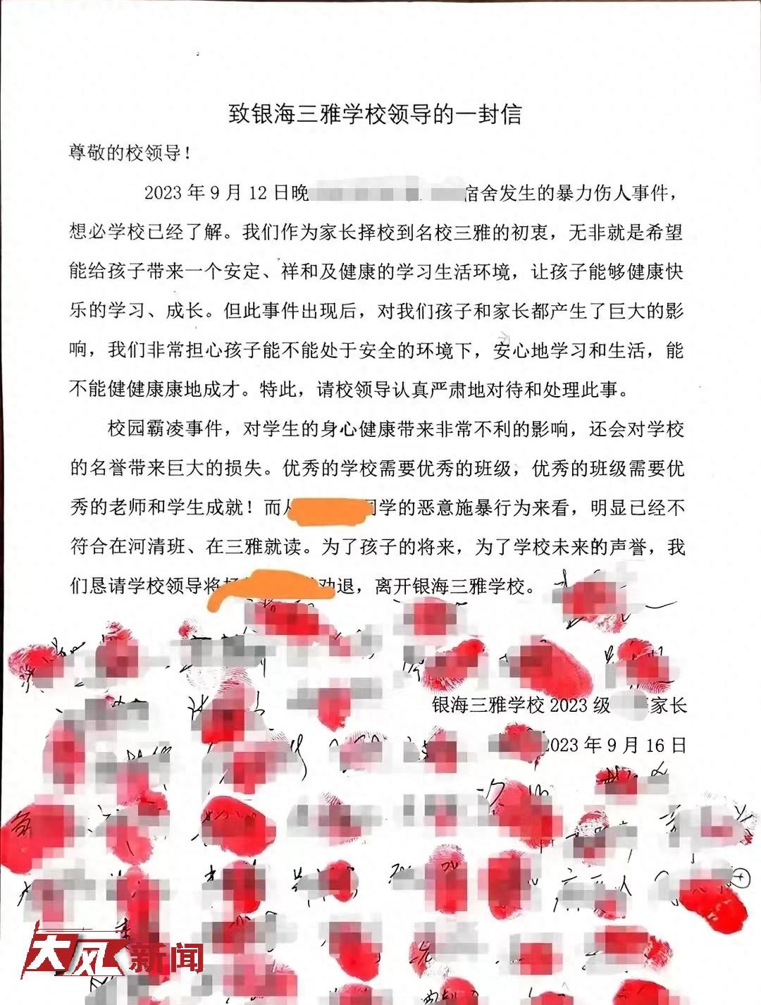 网传霸凌事件发生在南宁知名的民办学校银海三雅学校,网传信件有两封,联名信为《致银海三雅学校领导的一封信》,内容以9月12日晚发生的霸凌事件为由,要求校方驱赶霸凌者,信尾还附上了数十个红手印。