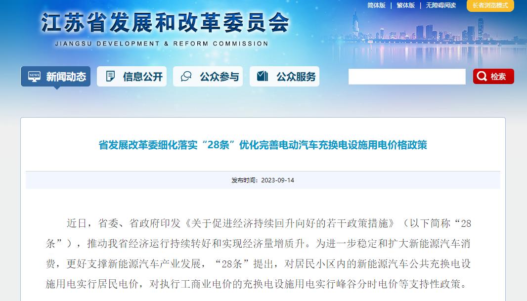 近日,省委、省政府印发《关于促进经济持续回升向好的若干政策措施》(以下简称“28条”),推动我省经济运行持续转好和实现经济量增质升。为进一步稳定和扩大新能源汽车消费,更好支撑新能源汽车产业发展,“28条”提出,对居民小区内的新能源汽车公共充换电设施用电实行居民电价,对执行工商业电价的充换电设施用电实行峰谷分时电价等支持性政策。9月12日,省发展改革委出台《关于进一步明确我省电动汽车充换电设施用电价格有关事项的通知》(以下简称《通知》),对我省现行电动汽车充换电设施用电价格政策进行优化和完善,政策包括严格执行电动汽车充换电设施用电政府定价和规范电动汽车充换电设施运营商服务费收费行为两个方面的内容,具体有五个亮点:
