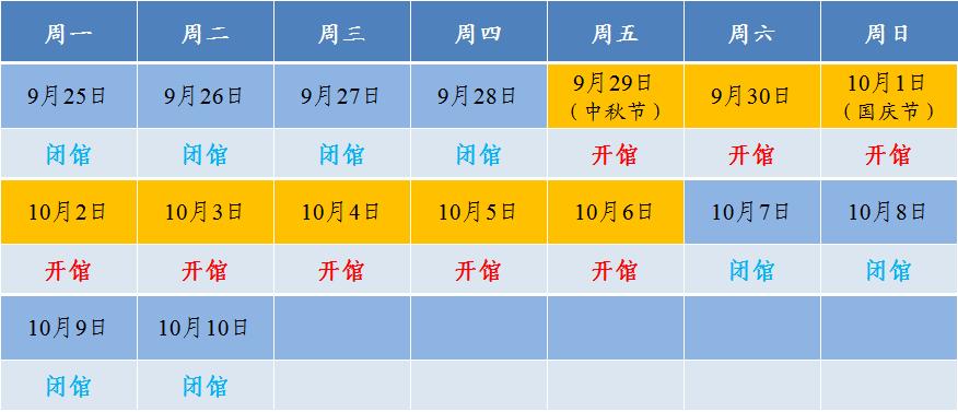 9月25日(周一)——9月28日(周四)闭馆;