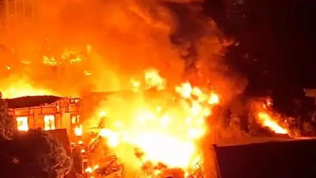 现场视频显示,熊熊大火引发冲天浓烟,消防人员赶到现场灭火。