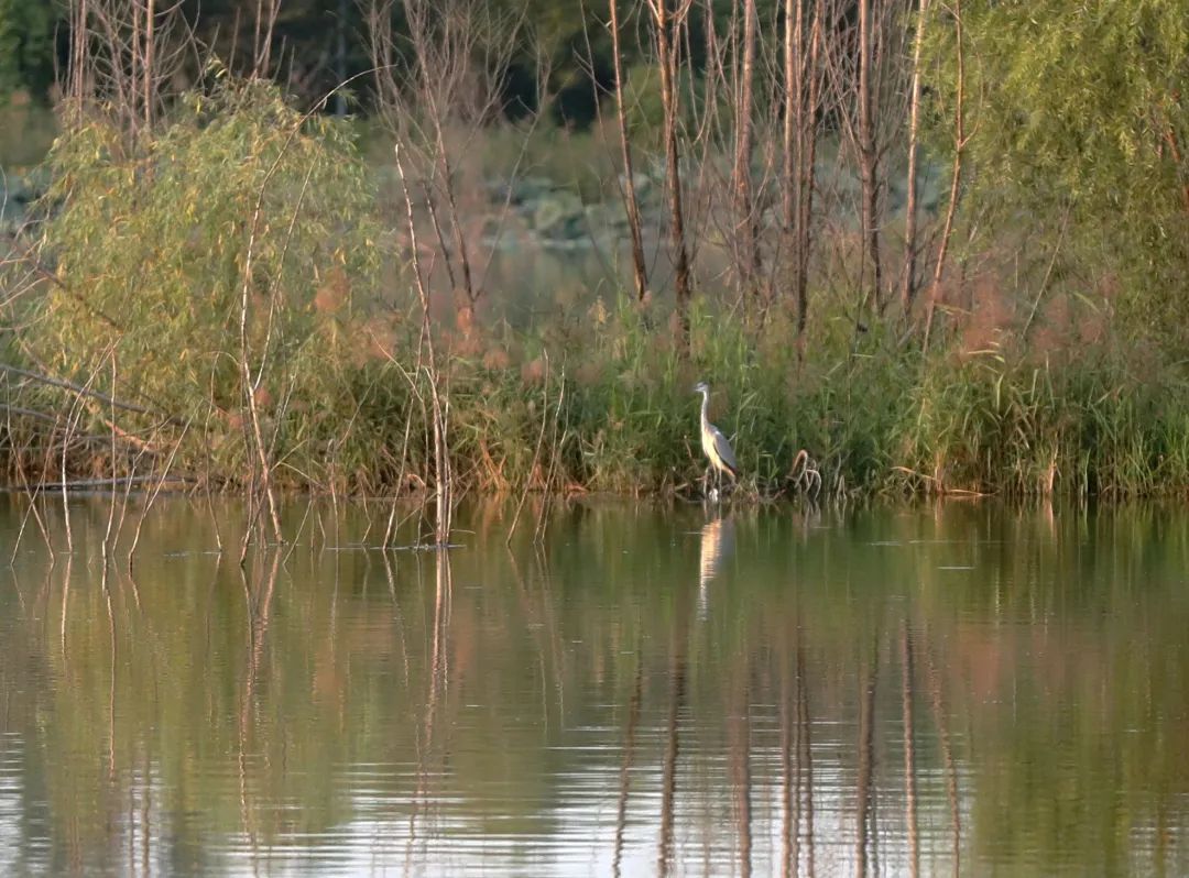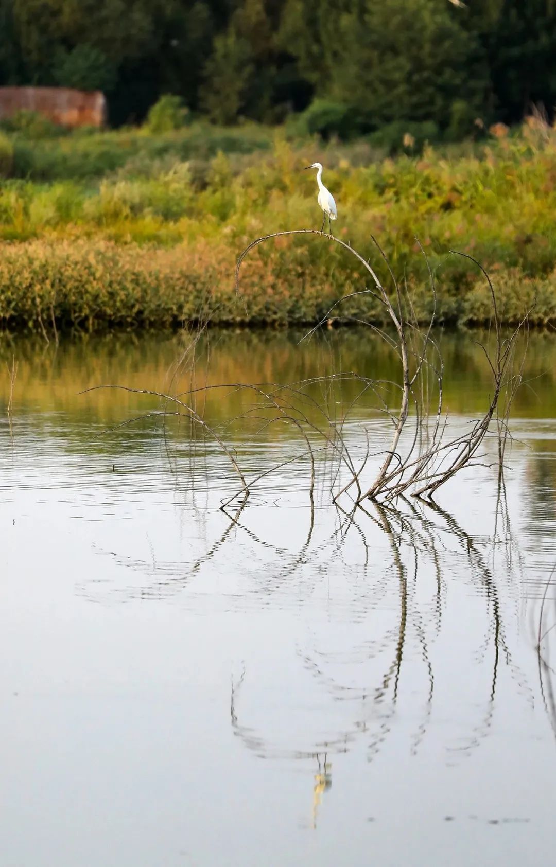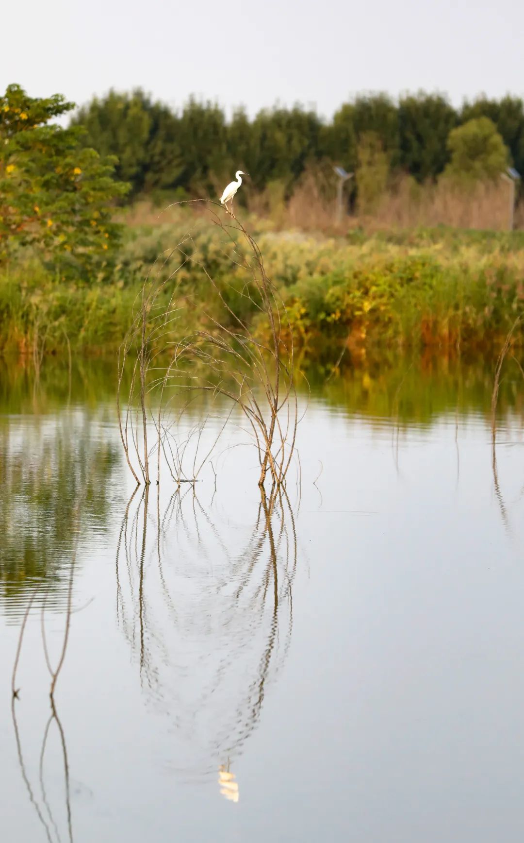 ▲白鹭与水中的倒影和周围的环境显得和谐有序