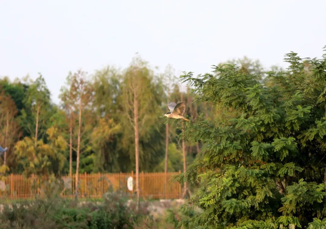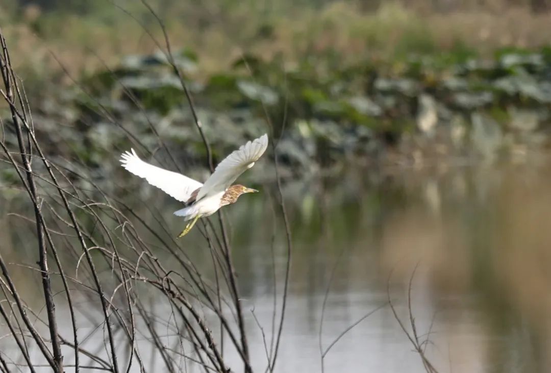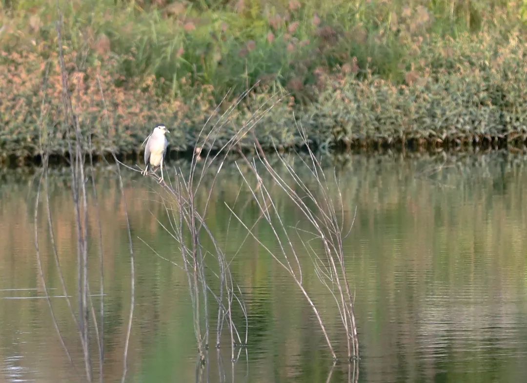 有一只体型略小的鹭鸟引起了我们的注意。它的翅膀也是白色,但与白鹭不同,它的头部与颈部是褐色条纹状。这是池鹭。