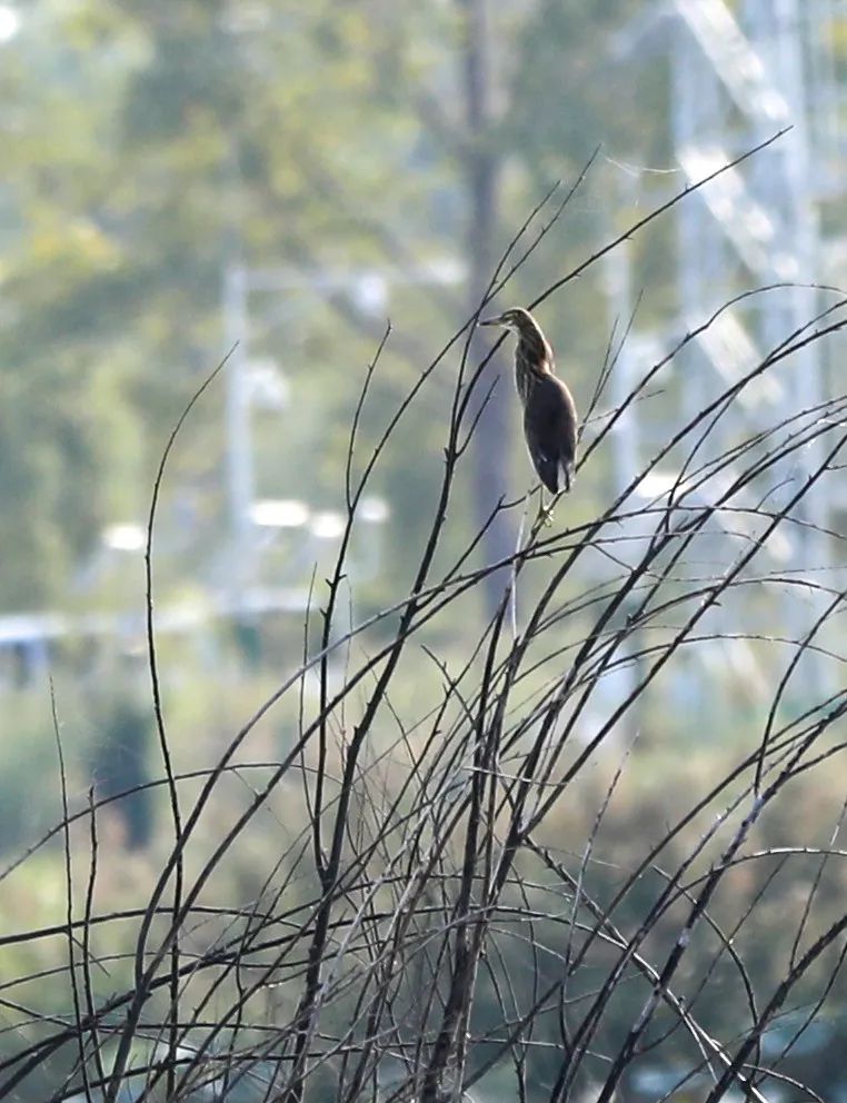 这是夜鹭,跟白鹭是“亲戚”,但颜值略逊白鹭。特别是夜鹭幼崽,一身花色羽毛,其貌不扬。