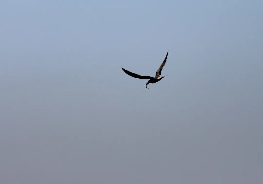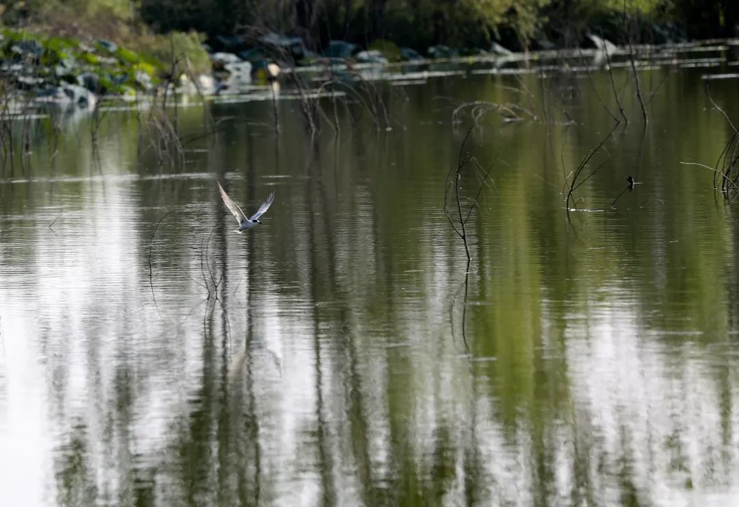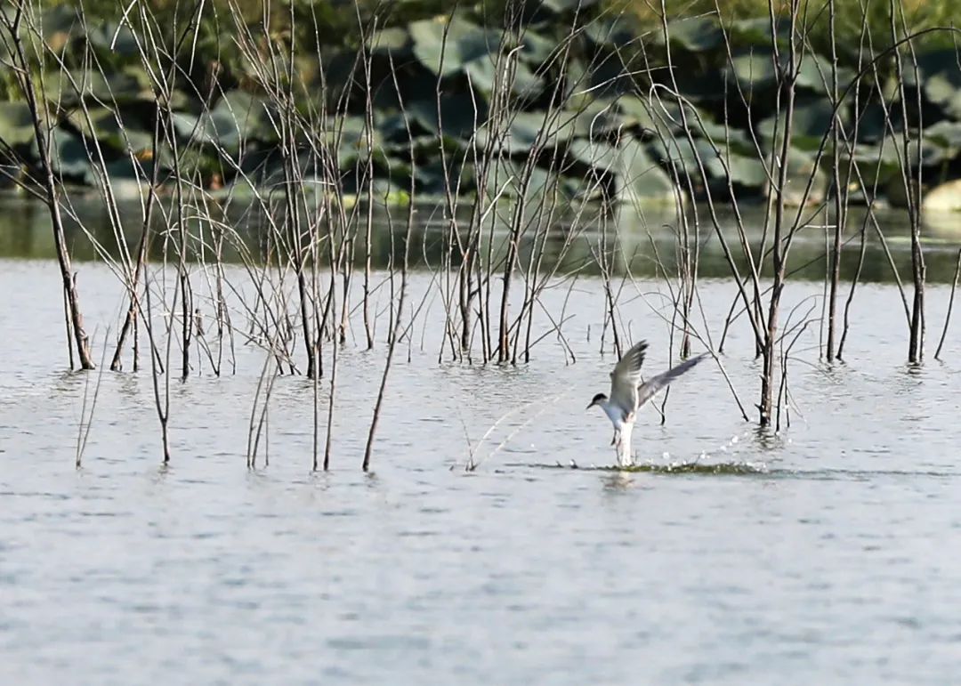 湿地边,燕鸥只只身姿轻盈,飞行时身姿优雅,时而贴近水面,时而直冲长空。当我们用目光追踪一只燕鸥时,发现它是一位优秀的“渔民”,捕鱼时稳、准、狠,让人叹服。这边刚刚举起镜头,还未及按下快门,它已经完成俯冲、抓鱼、飞起的动作,躲到一边享用美食去了。