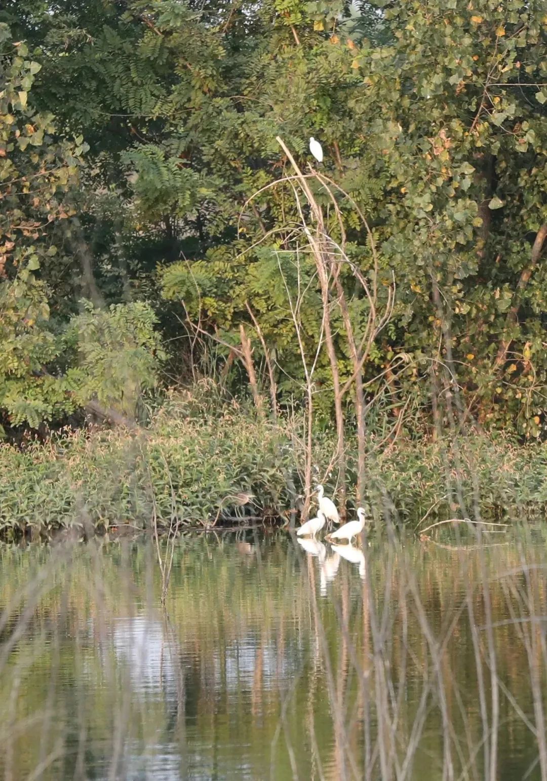 下了车,抬头望,只见一只白鹭昂头挺胸,一脚屈起,一脚立于树梢,望向远方。这里是黄河湿地巡护路,人未到,它先当一会儿巡护者。而水边泥土上,有一只正摆出一个舞蹈造型:双翅轻展,爪子微翘。白翅青脚,掩映水光天色,好一个人间天使!
