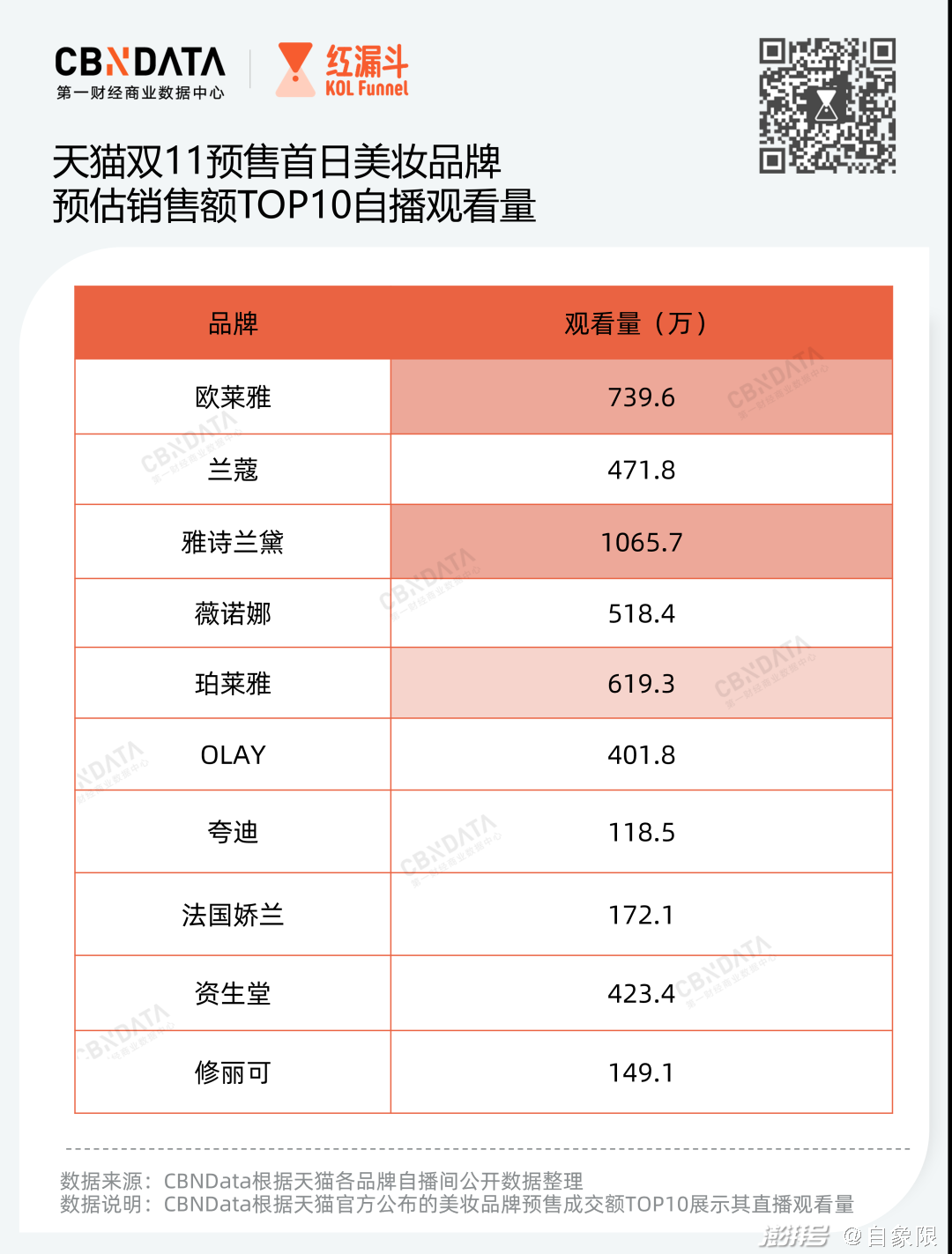 以李佳琦的基本盘美妆为例,在去年双十一预售首日,雅诗兰黛的品牌自播观看量已经超过千万,欧莱雅、珀莱雅、薇诺娜等品牌也都有大几百万的观看。