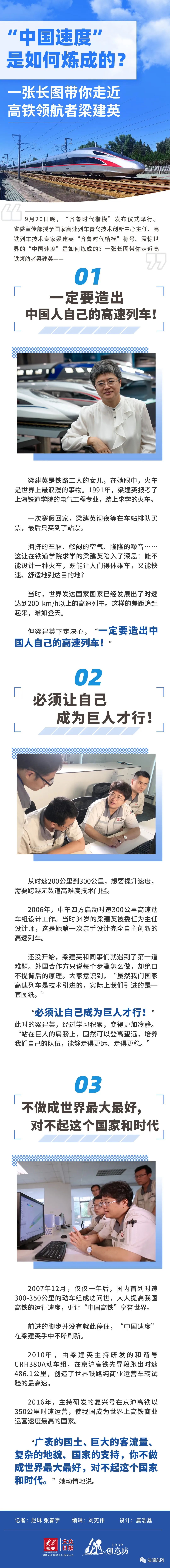 9月20日晚,“齐鲁时代楷模”发布仪式举行。中共山东省委宣传部授予国家高速列车青岛技术创新中心主任、高铁列车技术专家梁建英“齐鲁时代楷模”称号。震惊世界的“中国速度”是如何炼成的?一张长图带你走近高铁领航者梁建英——