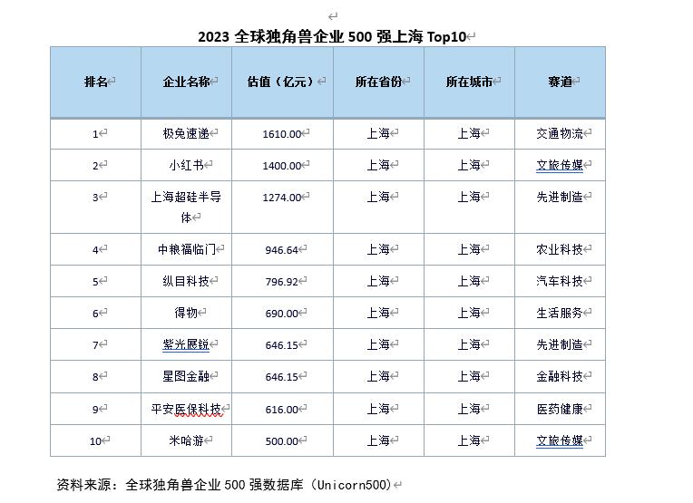 2023全球独角兽企业500强上海Top10估值合计为9125.86亿元,估值占比为3.23%。其中,第1位极兔速递,估值为1610.00亿元;第2位小红书,估值为1400.00亿元;第3位上海超硅半导体,估值为1274.00亿元;第4位中粮福临门,估值为946.64亿元;第5位纵目科技,估值为796.92亿元;第6位得物,估值为690.00亿元;第7位紫光展锐,估值为646.15亿元;第8位星图金融,估值为646.15亿元;第9位平安医保科技,估值为616.00亿元;第10位米哈游,估值为500.00亿元。