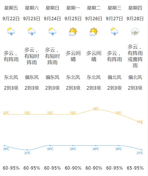 23-25日受偏东气流影响,我省多云间晴为主,伴有分散(雷)阵雨,部分市县有35℃左右高温。