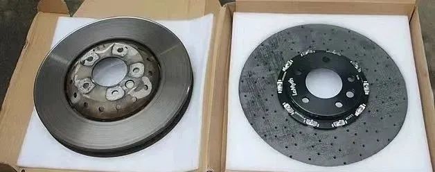 目前,除了超跑或改装以外,基本所有民用车型都采用的灰铸铁刹车盘(左图),右图为碳陶盘。灰铸铁刹车盘的特点是技术成熟、价格便宜,但性能欠缺。