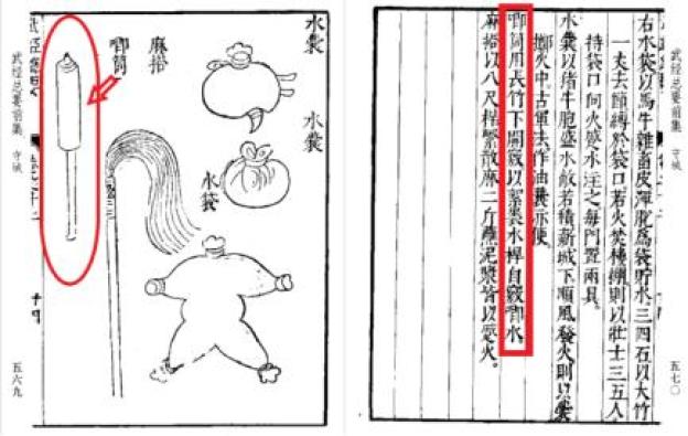 《武经总要》火备图在中国第一部规模宏大的官修综合性军事著作《武经总要》中,曾公亮这样记述一件救火器具:“唧筒,用长竹下开窍,以絮裹水杆,自窍唧水。”在这种唧筒内,紧裹在水杆上的棉絮起着活塞的作用,用手来回拉动水杆产生正压和负压,将水从竹筒开窍处吸入、喷出。这说明北宋时人们已经掌握了柱塞式泵浦的原理。